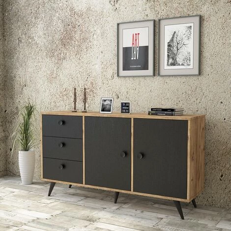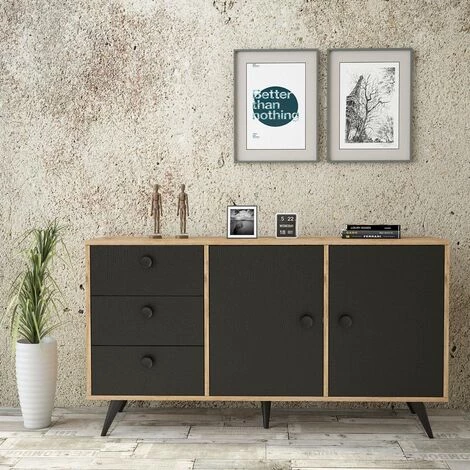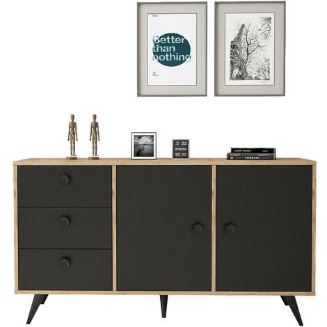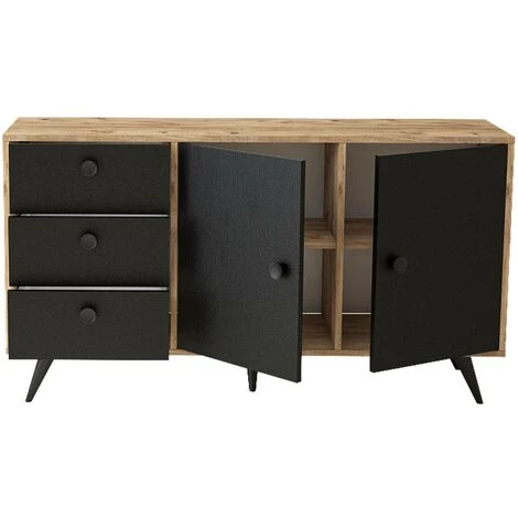 Comme votre bien-être dépend en partie de la qualité de votre cadre de vie, nous vous proposons de le perfectionner en vous offrant ce magnifique buffet 2 portes en panneaux de particules et bois mélaminé. Il dispose de 2 portes et de 3 tiroirs dans lesquels vous pourrez ranger vos vêtements et autres objets. Sa couleur noire et bois clair lui permettra de s accorder avec le décor de base du salon ou de la salle à manger dans lequel il sera posé. Il fera également sensation par son aspect particulièrement bien entretenu et son design moderne. Matèriaux : Mélaminé et Métal Dimension : 143 x 40 x 78,6 cm (L x P x H) Couleur : Noir et Bois clair