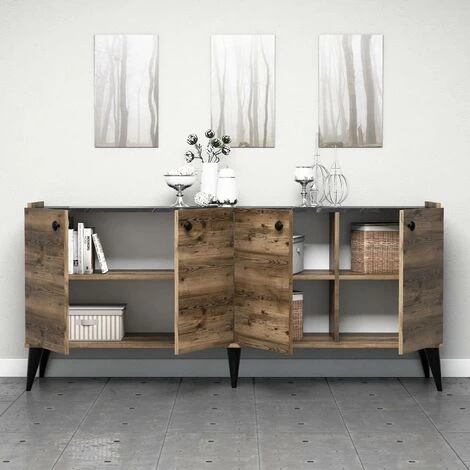 Le buffet Nidan est un véritable must-have dans un intérieur moderne. Sa structure géométrique au coloris neutre fait doucement référence au style scandinave et provençal, invitant une atmosphère de calme apaisant dans son environnement. Grâce à son design discret, le modèle n envahit pas la pièce, et sa couleur bois panachée avec des inserts stylisés dans le décor bois l agrandit optiquement. Ainsi, malgré sa grande taille, il convient même aux petits appartements. Nidan possède de nombreux compartiments sécurisés avec des portes, ils seront donc parfaits pour cacher vos trésors des invités curieux. Toutefois, si vous avez quelque chose qui mérite d être exposé, vous pouvez utiliser le plateau de table spacieux et lisse. Matériaux : Mélaminé Dimension : 182 x 41 x 82,5 cm (L x P x H) Couleur : Bois et Noir Effet marbre