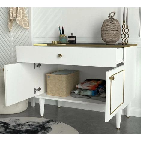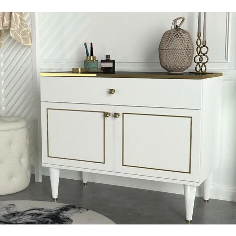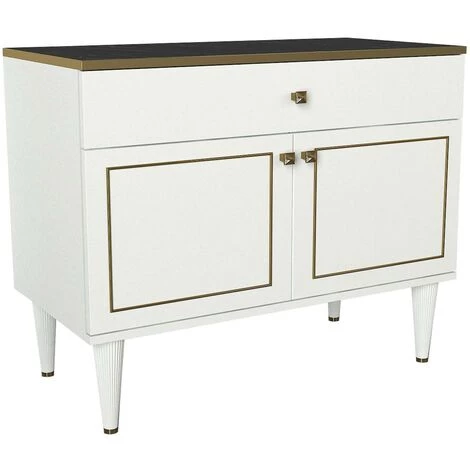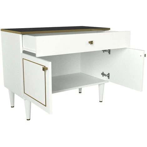 Vous imaginez un intérieur chic, rempli de meubles de style ? Si votre réponse est oui, ne manquez pas le buffet bas Ascendere ! Il présente des façades blanches et dorées brillantes et un élégant plateau effet marbre noir. Les petites poignées dorées soulignent l élégance du meuble. Ascendere se distingue par sa grande taille et son design unique; c est une solution de mobilier capable de créer un splendide point focal dans votre pièce et, grâce à son style classique et linéaire, Ascendere est capable de compléter parfaitement le décor de votre salon.