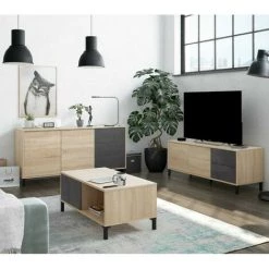 - Dimensions: Table basse : L 100 x l 50 x H 40 cm ; Buffet : L 154 x l 41 x H 74 cm ; Meuble TV : L 130 x l 41 x H 47 cm