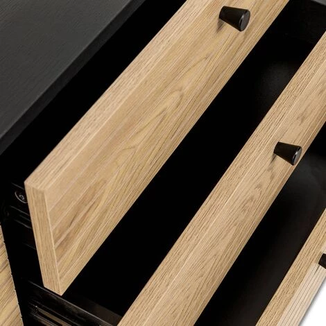 MDF décor chêne et noir, épaisseur 18 mm, pieds en métal noir.