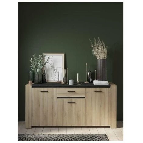 SHEFFIELD enfilade 3 portes/1 tiroir/2 niches de coloris chene kronberg/sidewalk – Dimensions L 189,4 x P 44,9 x H 88,9 cm – Aux extrémités, chaque côté est pourvu de 2 niches avec 1 rayon réglable sur 3 niveaux (dimensions L 62,8 x P 42,8 cm) et de 2 portes –
