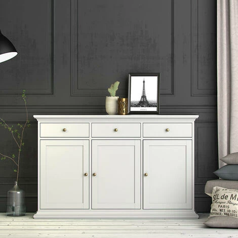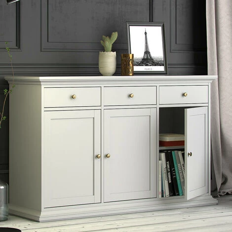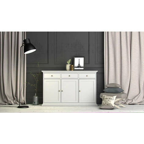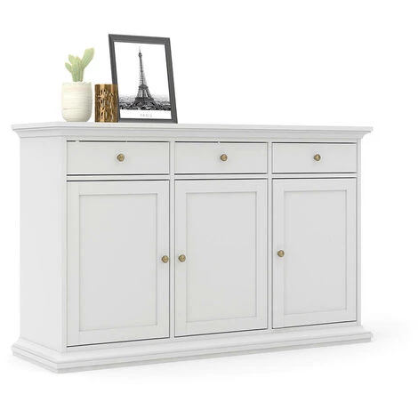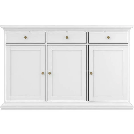 Buffet à trois nates et trois tiroirs, coloris blanc, 143,7 x 91,66 x 46,1 cm.