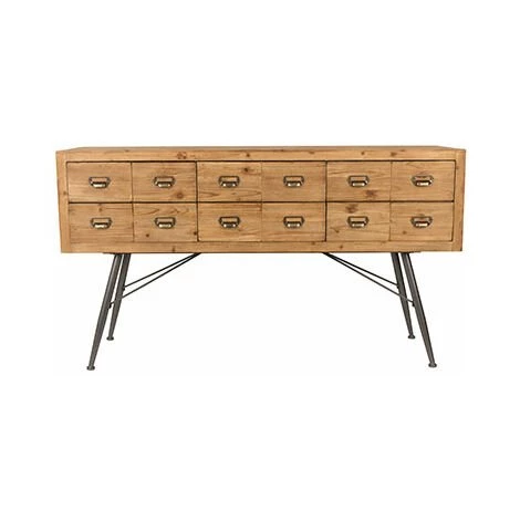 Profitant d’une belle teinte naturelle, ce bahut apportera de l’élégance et de l’authenticité à votre salle à manger. Monté sur un piètement en fer à la teinte noire, ce modèle met en avant un contraste très réussi et raffiné qui sublimera votre intérieur. En plus de son effet décoratif, il vous offrira la possibilité d’organiser au mieux votre espace de vie, ses six tiroirs vous permettant de ranger tout type d’article. Réalisé avec une structure en sapin massif et des poignées en acier, ce meuble vous accompagnera pendant de longues années.