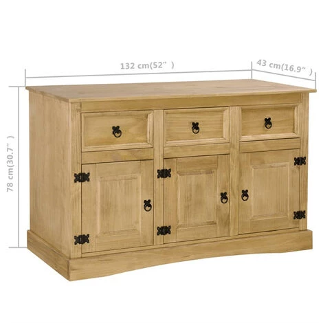 Fabriqué à partir de bois de pin massif, le buffet est solide et robuste. Il dispose de plusieurs tiroirs et compartiments qui offrent un grand espace de rangement. Les 3 portes aident à garder vos articles sans poussière et hors de vue. Le dessus robuste est idéal pour placer des corbeilles de fruits, des cadres photo, des plantes en pot et d’autres objets décoratifs.