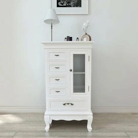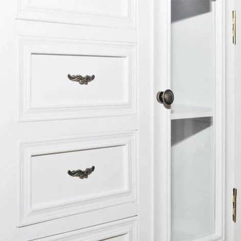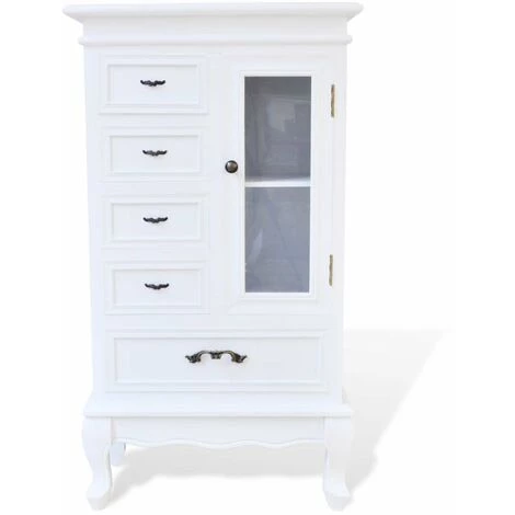 Cette armoire au design ancien est un excellent meuble pour le bureau, le salon, la chambre à coucher, etc. Elle sera certainement un excellent ajout à votre chambre à coucher, bureau ou même couloir. Les cinq tiroirs sont conçus pour ranger vos livres, vêtements et autres articles. Avec deux grandes étagères d’affichage, il y a beaucoup d’espace pour le stockage et les affichages supplémentaires et la porte en verre est idéale pour garder la saleté et la poussière à distance. Cette armoire est construite à partir de MDF et de pinède de haute qualité avec une finition peinte en blanc pour plus de durabilité, ce qui vous donne des années de service.