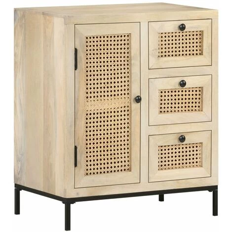 Si vous recherchez une touche de charme rustique à ajouter à votre décoration intérieure, ce buffet en bois de manguier massif sera pour vous. Le bois de manguier massif est un bois dur tropical. Il a d’une part la force de soutenir le poids, et d’autre part résiste à l’usure du temps. De plus, le savoir-faire exquis et les beaux grains de bois rendent chaque pièce d’armoires latérales légèrement différente l’une de l’autre. L’armoire en bois est équipée d’un grand espace de rangement, donc vous pouvez afficher ou garder bien organisés tous les articles que vous souhaitez. La base en acier contribue à sa robustesse et à sa stabilité. De plus, l’armoire de rangement présente des motifs de canne tissé à la main sur la porte et les tiroirs, ajoutant à son charme rustique. Remarque importante : les couleurs varient d’une pièce à l’autre, ce qui rend chaque buffet en bois unique.