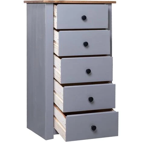 Complétez votre chambre à coucher, votre salon ou votre bureau avec notre buffet en pin massif ! Elle peut également être utilisée comme support de téléphone à côté de votre canapé ! Fabriqué en bois de pin massif, ce meuble à tiroirs Panama est extrêmement durable et robuste. Le buffet offre un grand espace de rangement avec 5 tiroirs. En outre, le dessus de table robuste est idéal pour afficher des objets décoratifs, des cadres photo ou des plantes en pot. Il est facile d’essuyer avec un chiffon sec. Le support de téléphone est facile à assembler.