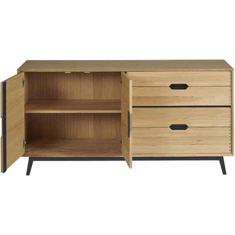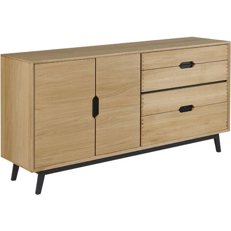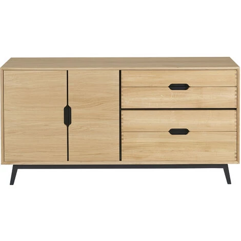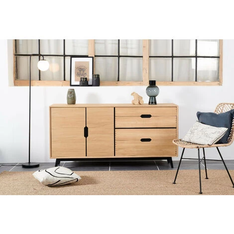 Le buffet bas JOYCE aux influences scandinaves est fabriqué en bois massif et placage de chêne et se décline en deux versions: finition chêne avec détails en blanc ou finition chêne avec détails en noir. Ces deux déclinaisons ont été conçues pour s’adapter aux ambiances de votre salle à manger. Les détails en blanc pour une déco chaleureuse et cosy, et les détails en noir pour un style plus moderne ou industriel.