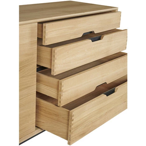 Les quatre tiroirs aux dimensions différentes s’ouvrent par des passes doigts et se referment en douceur avec leur système de fermeture progressive. Les façades de tiroir présentent un assemblage en queue d’aronde rappelant les techniques d’ébénisterie utilisées dans la fabrication des meubles de qualité.