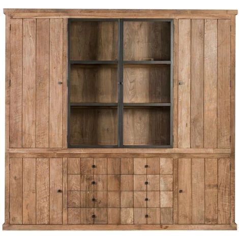 Ce vaisselier est composé de trois matériaux qui s’accordent parfaitement : le bois massif recyclé, le métal et le verre.
