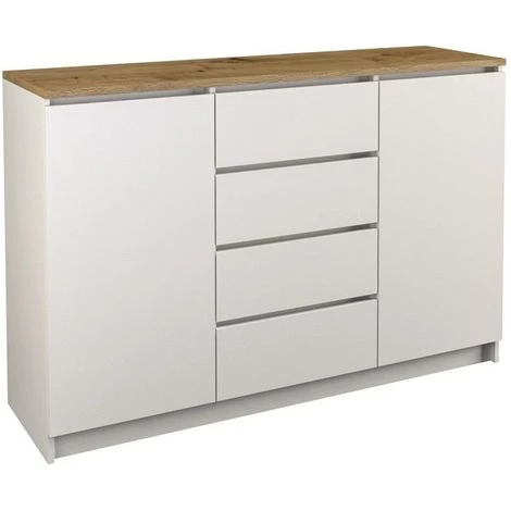 Buffet KARA à quatre tiroirs et deux portes apportera une touche de modernité et harmonie à votre salon. Avec sa matière, ses lignes épurées et ses détails elle s’accordera parfaitement à votre intérieur. Sa structure en panneaux de particules mélaminés et son plateau solide de 22 mm se caractérisent par une grande durabilité et une finition tendance