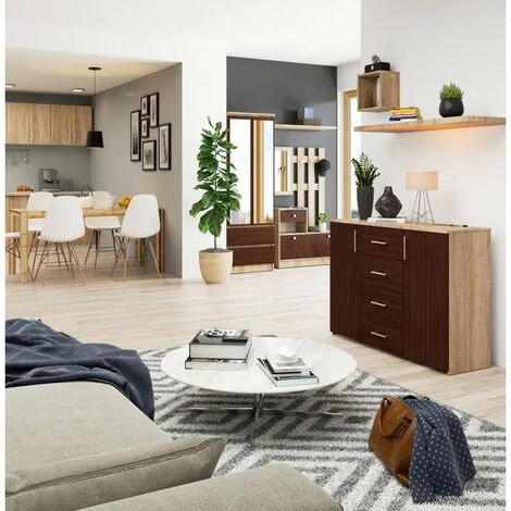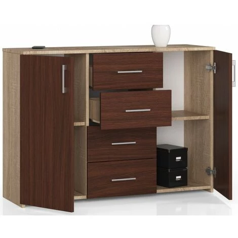 Ce buffet est l’organisateur parfait pour vos objets. 2 rangements et 4 tiroirs permettent de maintenir l’ordre. Il dispose également d’un large plateau où vous pouvez placer toutes sortes de décorations. Le stratifié utilisé augmente la résistance aux rayures, aux changements de température et est facile à nettoyer. Le corps est de couleur sonoma, les façades sont de couleur wengé.