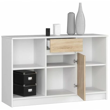Le buffet présenté peut constituer un élément intéressant de la décoration du salon et servir d’un meuble fonctionnel pour le rangement. La partie centrale du buffet se compose d’un seul tiroir et d’une porte, ce qui permet de ranger vos objets. De plus, il dispose de quatre étagères symétriques séparées offrant beaucoup d’espace d’exposition. Le corps est de couleur blanche, les façades sont de couleur sonoma.