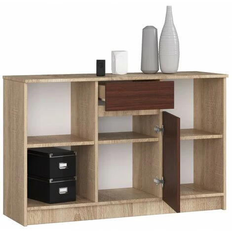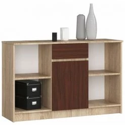 Le buffet présenté peut constituer un élément intéressant de la décoration du salon et servir d’un meuble fonctionnel pour le rangement. La partie centrale du buffet se compose d’un seul tiroir et d’une porte, ce qui permet de ranger vos objets. De plus, il dispose de quatre étagères symétriques séparées offrant beaucoup d’espace d’exposition. Le corps est de couleur sonoma, les façades sont de couleur wengé.