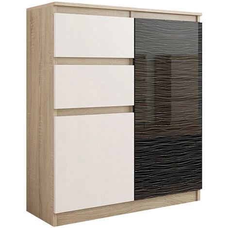 Commode moderne de la collection LISBON trouvera facilement sa place dans chaque intérieur. Pratique, elle dispose d’un bel espace de rangement avec ses 2 tiroirs et trois niches de rangement. Son style épuré répondra aux attentes de tous ceux qui apprécient l’alliance de la simplicité et de l’élégance. Design minimaliste – les tiroirs sans poignées assurent le confort d’utilisation et accentuent son caractère contemporain. C’est un meuble multifonctionnel qui vous servira dans votre chambre, séjour ou salon et même dans votre bureau pour ranger des documents.
