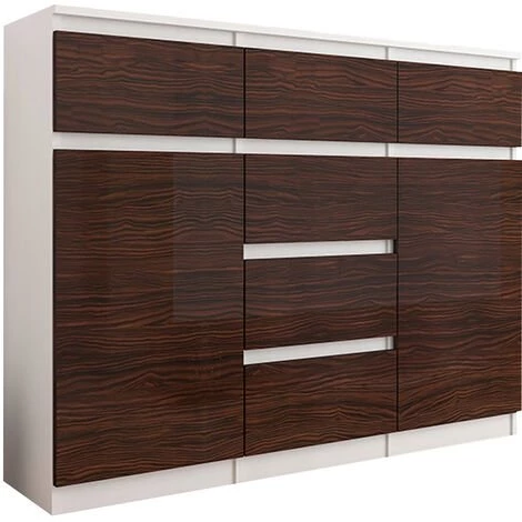 Cette commode moderne de la collection MONACO trouvera facilement sa place dans chaque intérieur. Pratique, elle dispose d’un bel espace de rangement avec ses 6 tiroirs et 2 portes avec deux niches de rangement. Son style unique, structure en panneaux imitation bois mat et façades brillants, répondra aux attentes de tous ceux qui apprécient l’alliance de la simplicité et de l’élégance. Design minimaliste – les tiroirs sans poignées assurent un confort d’utilisation et accentuent son caractère contemporain.