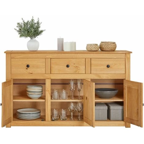 … apportera un côté chaleureux et élégant à votre décoration, que ce soit dans votre salon, votre cuisine ou votre salle à manger. Vous pourrez facilement y ranger toutes vos assiettes et plats derrière les 3 grandes portes battantes. De plus les 3 tiroirs seront parfait pour accueillir vos couverts, du linge de maison ou tout autres objets. Avec sa structure en pin massif au style maison de campagne, ce meuble de rangement se mariera parfaitement avec les reste de votre mobilier.