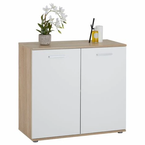 – Le buffet est fabriqué à partir de panneaux de particules de bois, recouvert d’un mélaminé décor chêne sonoma et blanc.