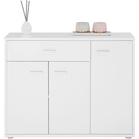 – Le buffet est fabriqué à partir de panneaux de particules de bois, recouvert d’un mélaminé de coloris blanc mat.