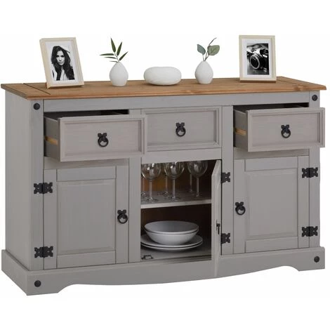 – Le buffet est fabriquĂ© en pin massif et lasurĂ© de coloris gris.