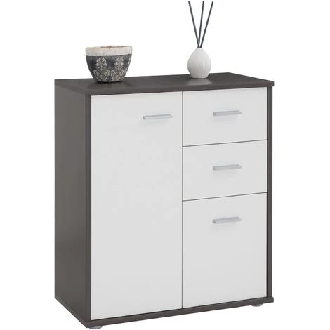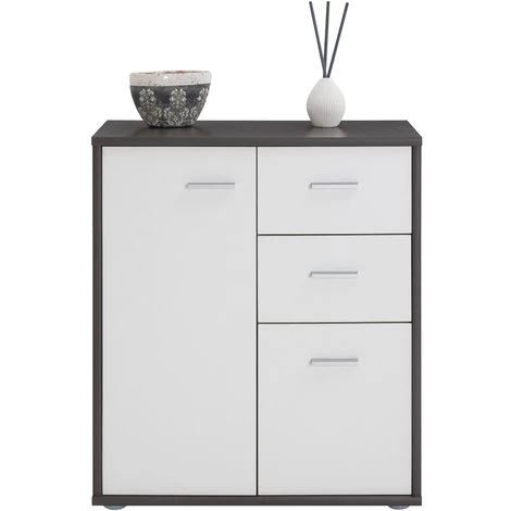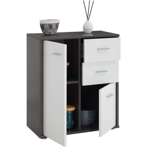 – Le buffet est fabriqué à partir de panneaux de particules de bois, recouvert d’un mélaminé de coloris gris mat et blanc mat.