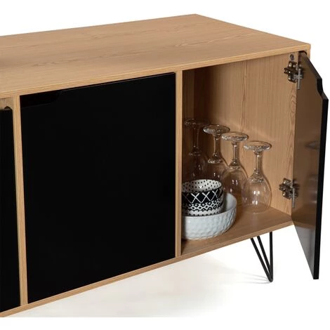 Descriptif du buffet bas vintage NOEMI 3 portesLaissez entrer le style rétro chic chez vous avec le buffet bas vintage NOEMI 3 portes. Ses coloris chics et élégants lui permettent de s’intégrer à n’importe quel intérieur, pour une décoration chaleureuse et tendance.Fonctionnel et utile, le buffet bas 3 portes NOEMI offre l’avantage d’avoir plusieurs rangements. Grâce à ses trois placards fermés par une porte à poignée type encoche, rangez votre vaisselle, vos appareils ménagers, vos livres de cuisine, ou encore vos papiers en toute discrétion.Avec son plateau d’une longueur généreuse de 113 cm, il sera le parfait support pour y disposer objets de décoration ou appareils multimédia selon vos besoins. Design et pratiques, ses quatre pieds épingle originaux forme trombone en métal lui assurent stabilité et robustesse au quotidien, ainsi qu’une ligne aérienne pour ne pas encombrer votre salon !Dans un salon, une salle à manger ou toute autre pièce de la maison, le buffet bas vintage NOEMI 3 portes s’accorde à vos envies de déco tendance et actuelle grâce à ses couleurs sobres et chaleureuses.Il ne vous reste plus qu’à vous installer confortablement dans votre séjour et à profiter du nouveau look de votre pièce de vie !Dimensions du buffet bas vintage NOEMI 3 portesDimensions totales : Longueur 113 cm x largeur 40 cm x Hauteur 60 cmDimensions des placards : Longueur 35,5 cm x largeur 43 cm x Hauteur 43 cmHauteur des pieds : 15 cmRetrouvez toute notre collection de meubles vintage sur notre boutique en ligne !