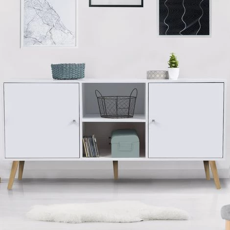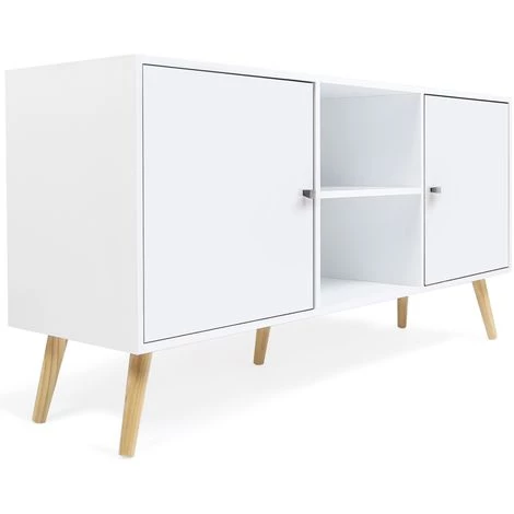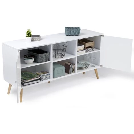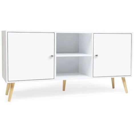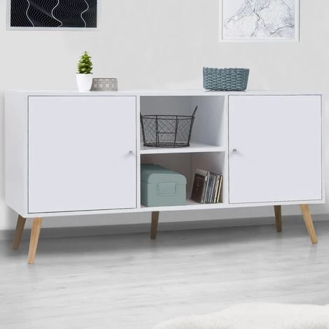 Le design nordique s’invite dans votre salon ou salle à manger avec le buffet bas EFFIE 2 portes en bois blanc.Ses lignes simples et épurées venues tout droit des tendances de décoration scandinave apporteront une ambiance chaleureuse et cosy à votre intérieur.Stable et robuste, ce très joli buffet, aux finitions soignées, surélevé de pieds en bois massif (pin), inclinés, est bois MDF (épaisseur 1,5 cm).Astucieux et pratique, il est équipé de 2 placards blancs ton sur ton finis avec de petits boutons argentés raffinés et de 2 niches pouvant servir de compartiments pour ranger votre vaisselle ou exposer vos bibelots afin d’apporter une touche de décoration.Derrière les 2 portes battantes se cache une étagère intérieure supplémentaire.La combinaison de rangements ouverts et fermés permet de cloisonner les espaces et d’organiser votre rangement en toute discrétion. Design et fonctionnel à la fois !N’hésitez pas à mixer le buffet bas EFFIE aux lignes sobres et à la couleur intemporelle avec des couleurs pastel et des motifs graphiques dans votre salon ou salle à manger pour un look moderne garanti !Dimensions du buffet scandinave 2 portes bois blancDimensions totales : Longueur 140 cm x largeur 40 cm x Hauteur 70 cmDimensions de la niche : Longueur 40 cm x largeur 37,5 cm x Hauteur 46,5 cmModèle disponible en différents coloris sur notre boutique en ligne :- Buffet bas EFFIE bois blanc et grisRetrouvez toute notre collection EFFIE sur notre boutique en ligne ! – HORS CORSE -article non livrable en Corse