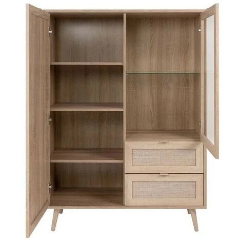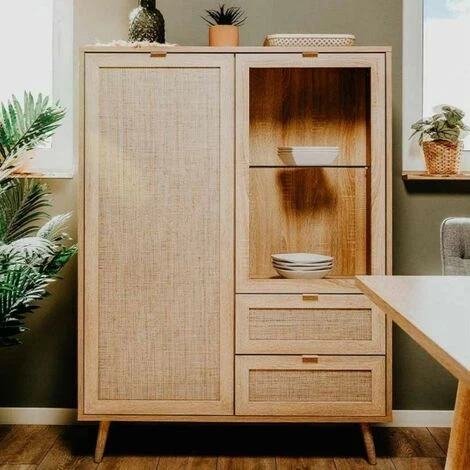 Buffet avec deux tiroirs et deux portes, dont une en verre pour ranger tous les objets en vue, la finition naturelle comme les portes effet osier et la structure couleur chêne est très caractéristique. Meuble idéal pour ceux qui veulent meubler n’importe quel environnement avec originalité.