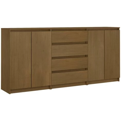 Ces armoires latérales en bois dégagent un charme rustique et font un excellent supplément à votre espace de vie. Ces tables de chevet sont fabriquées en bois de pin massif, ce qui garantit leur solidité et leur durabilité. Composées de 2 armoires avec 2 portes et 3 compartiments, 1 armoire avec 4 tiroirs, elles offrent un espace de rangement suffisant pour garder vos différents articles bien organisés et à portée de main. Le dessus de table robuste est également idéal pour exposer des objets décoratifs, des cadres photo ou des plantes en pot. De plus, ces tables de chevet sont faciles à nettoyer avec un chiffon humide. Redécorez votre intérieur avec ces armoires élégantes !Couleur : marron mielMatériau : Pin massifDimensions totales : 180 x 36 x 84 cm (l x P x H)Dimensions (chaque armoire) : 60 x 36 x 84 cmL’assemblage est requisAVERTISSEMENT :Afin d’éviter qu’il ne bascule, ce produit doit être utilisé avec les accessoires de fixation murale fournis.La livraison contient :2 x armoire latérale (avec 2 portes)1 x armoire latérale (avec 4 tiroirs)Legal Documents:Nous ne livrons pas en Corse.