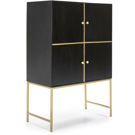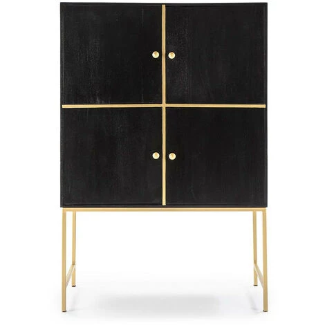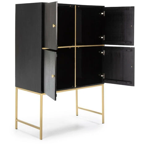 Ce joli bahut trouvera sûrement sa place dans votre chambre à coucher, votre séjour, votre salon ou votre bureau. Sa structure est entièrement en bois massif peint en noir avec des pieds en métal doré. Il vous offre un bel espace de rangement grâce à ses 4 portes et un emplacement supplémentaire pour exposer des objets sur son plateau. Particulièrement esthétique, il apportera une note de modernité à votre espace.Matière Bois massifPieds en métalL 100 x H 151 x P 50 cm – 55 kgGarantie : 2 ans Livré montéDimensions colis : 108 x 60 x 159 cm – 60 kgNous ne livrons pas en Corse.
