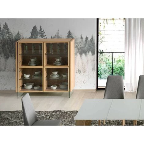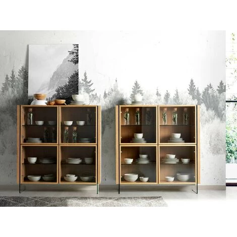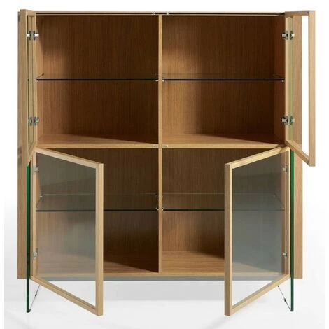 Ce somptueux bahut haut en bois plaqué chêne véritable d’excellente qualité de la collection Zooka affiche une ligne résolument élégante qui fera de votre séjour une pièce ultra raffinée. Derrière ses 4 portes vitrées vous offre un bel espace de rangements pour vos ustensiles. L’alliance du bois de chêne véritable et des parois latérales en verre crée un design inédit fait de matières nobles.D’autres meubles de la même collection peuvent s’ajouter à cet article pour créer une décoration harmonieuse.Nous ne livrons pas en Corse.