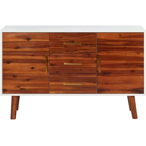 Ce buffet, qui présente une utilité pratique, est destiné à être un supplément idéal à votre salon. Ce buffet en bois est fabriqué en bois d’acacia massif et en MDF, ce qui le rend très robuste et durable. Le bois d’acacia massif est un bois dur à grains denses. De plus, l’artisanat exquis et les magnifiques grains de bois rendent chaque pièce légèrement différente l’une de l’autre. L’armoire latérale comprend 3 tiroirs et 2 portes, offrant un grand espace de rangement pour les livres, les appareils multimédia et autres articles essentiels. Le dessus de buffet est parfait pour exposer des objets décoratifs, des cadres photo ou des plantes en pot.Matériau : bois d’acacia massif avec finition naturelle, MDF blanc, aluminiumDimensions : 110 x 35 x 70 cm (l x P x H)Avec des poignées en aluminiumL’assemblage est requisNous ne livrons pas en Corse.