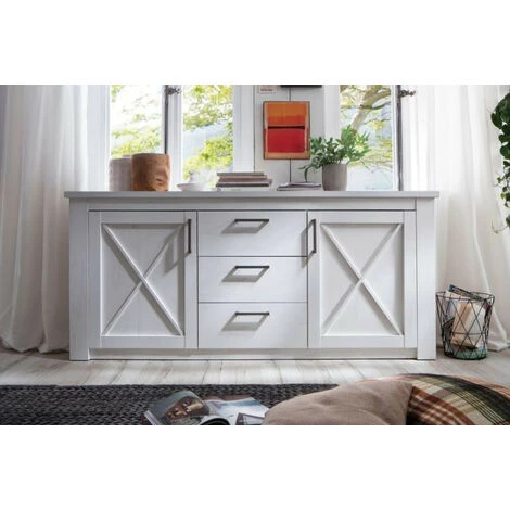 Ce buffet au design épuré est l’élément parfait pour un séjour convivial et chaleureux. Il est conçu en bois mélaminés, avec un revêtement effet pin blanc. Son décor uni et brillant lui confère un look éclatant très sympa. Ce meuble robuste s’adapte à tous les styles de déco intérieur. En plus, il offre plusieurs espaces de rangements grâce à ses 4 compartiments spacieux et ses 3 tiroirs.Matériau: panneaux de particules mélaminés décor pin blancColoris : blancNombres de portes : 2Nombres de tiroirs : 3Poignée : métal argentéDimensions : L 197 x P 42 x H 88 cmFabrication : AllemandeGarantie : 2 ansNous ne livrons pas en Corse.