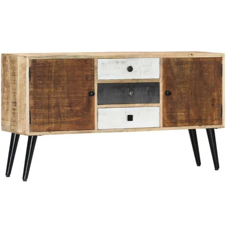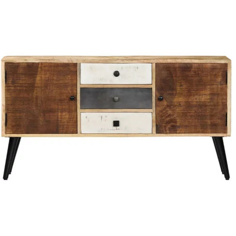 Habilement conçu en manguier massif, ce buffet est robuste et durable. Sa structure en manguier massif clair avec ses pieds en métal noir lui donne un look industriel. Il est équipé de 3 tiroirs de différentes couleurs et de 2 portes pour vous offrir un espace de rangement. Le dessus est idéal pour poser des objets décoratifs comme une montre à réveil ou cadre à photo. Il fera ressortir un charme rustique à votre intérieur.Nous ne livrons pas en Corse.