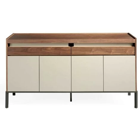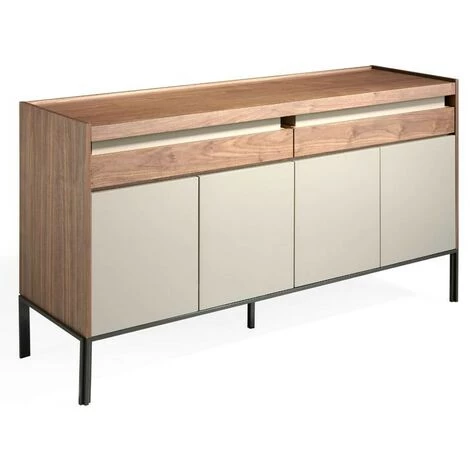 Ce superbe buffet en bois de noyer véritable présenté avec une façade en bois noyer laqué et des pieds en acier noir est idéal pour votre intérieur. Reposé sur ses pieds en acier noir stable, elle est robuste et résistante. Il est équipé de 4 portes et 2 tiroirs pour vous offrir des espaces de rangement.Ce meuble de rangement est fabriqué en Espagne avec des matériaux d’excellente qualité. Il existe en plusieurs coloris pour satisfaire vos besoins.L 160 x H 84 x P 48 cm – 84 KgMatériaux : Bois massif de noyer et bois MDF laqué 3 couchesPlateau : Bois massif de noyerPieds : acier noirCouleurs principale : bicoloreLivré par une société de transport de meubles sur prise de RDV à votre convenance2 Colis 162 x 85 x 52 / 124 x 24 x 22 – Poids:78 Kg / 6 KgD’autres meubles de la même collection peuvent s’ajouter à cet article pour créer une décoration harmonieuse.Nous ne livrons pas en Corse.