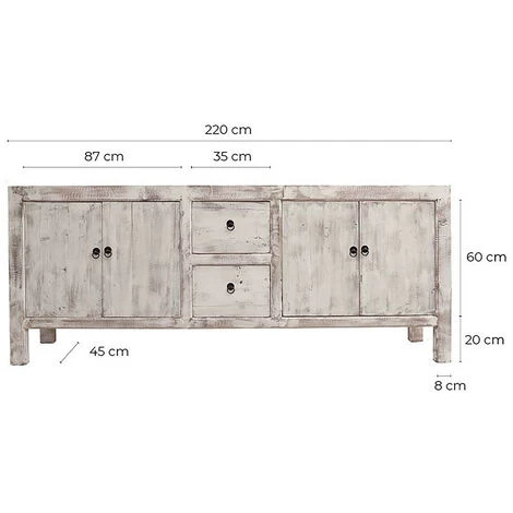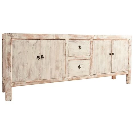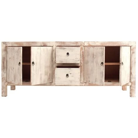 Ce buffet est idéal pour meubler votre salle à manger ou votre cuisine. Pratique, il est composé de 2 tiroirs et de 4 portes et trouvera facilement sa place dans votre intérieur quelque soit votre décoration.Dimensions : L 220 x H 90 x P 45 cmFabrication artisanaleMatière : Bois de pin recycléGarantie : 2 ansNous ne livrons pas en Corse.