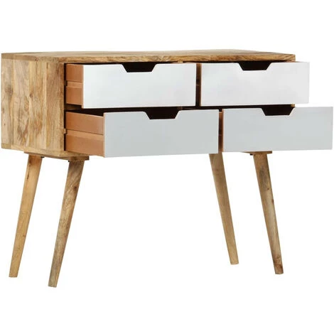Ce buffet dégage un charme intemporel qui sera un supplément accrocheur à votre décoration intérieure. Cette armoire vintage est fabriquée en bois de manguier solide, un bois dur à grains denses. Le bois brut de manguier a non seulement la force de supporter le poids, mais résiste également à l’usure du temps. En conséquence, cette table d’appoint est extrêmement stable, durable et accrocheuse. Le savoir-faire exquis et les grains de bois élégants rendent chaque meuble distinctif et légèrement différent l’un de l’autre. De plus, cette armoire en bois solide dispose de 4 tiroirs, offrant un espace de stockage pour vos revues, livres, ainsi que divers autres articles. Remarque importante : Les couleurs et le grain du bois peuvent varier d’une pièce à l’autre, ce qui rend chaque table d’entrée unique la livraison est aléatoire.Couleur : Marron, blanc, grisMatériau : bois de manguier massifDimensions : 85 x 40 x 71 cm (l x P x H)4 tiroirs inclusSurface polie, peinte et laquéeL’assemblage est requisNous ne livrons pas en Corse.