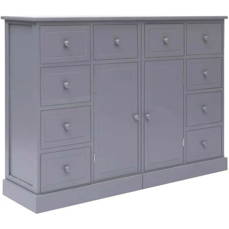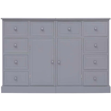 Avec son utilité élégante et pratique, cet ensemble de buffet deviendra le complément idéal dans votre maison existante. Fabriqué en paulownia de qualité, en bois de peuplier et en MDF, ce buffet est extrêmement robuste et durable. Il se compose de 10 tiroirs et de 2 placards offrant un grand espace de rangement pour vos objets divers, tels que des clés, un bloc-notes, des livres, des magazines ou d’autres bibelots et objets de première nécessité. En outre, le grand plateau est idéal pour placer un appareil multimédia ou pour afficher des objets décoratifs. Vous pouvez combiner deux buffets ou les laisser séparés. Le buffet est facile à assembler. La livraison comprend 2 buffets individuels dans un ensemble.Couleur : grisMatériau : bois de Paulownia et peuplier + panneau MDFDimensions : 113 x 30 x 79 cm (l x P x H)Comprend 10 tiroirs et 2 portesTiroirs avec poignées de bouton pour une ouverture facileLa livraison comprend 2 buffets individuels dans un ensembleNous ne livrons pas en Corse.