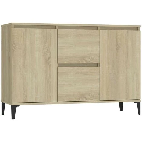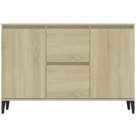 Ce buffet apporte un charme industriel à votre coin salon. L’armoire latérale est suffisamment solide et durable pour assurer un service de longue durée. Les pieds en métal lui assurent une stabilité supplémentaire. Cette bibliothèque comprend 2 tiroirs et 2 portes, offrant un grand espace de rangement pour vos objets. Vous pouvez également placer des objets décoratifs et des cadres photo sur le dessus robuste. De plus, le meuble de rangement est facile à nettoyer avec un chiffon humide.Couleur : chêne sonomaMatériau : aggloméré, métalDimensions : 104 x 35 x 70 cm (L x l x H)L’assemblage est requisNous ne livrons pas en Corse.