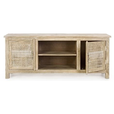 Ce buffet apportera une note boisée très agréable à votre intérieur. Avec 2 portes qui entourent 2 niches superposées, ce meuble vous offrira un espace de rangement agréable. En bois de manguier de couleur clair avec des décorations fait main, il est de toute beauté. Matière : Bois de manguierCouleur : Bois clair Dimensions : L 150 x P 40 x H 60 cmNombre de colis : 1Fabrication : Espagne Garantie : 2 ans Nous ne livrons pas en Corse.