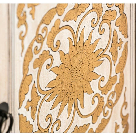 Ce superbe buffet en orme massif blanc et doré sublimera votre séjour. Il dispose de 4 portes et de 3 tiroirs vous offrant un espace de rangement pour avoir une pièce harmonieuse. Son design apportera une touche orientale à votre intérieur.Dimensions : L 160 x H 85 x P 45 cmGarantie : 2 ansNous ne livrons pas en Corse.