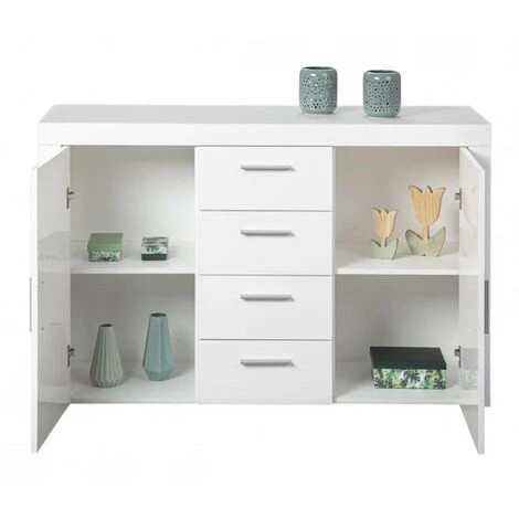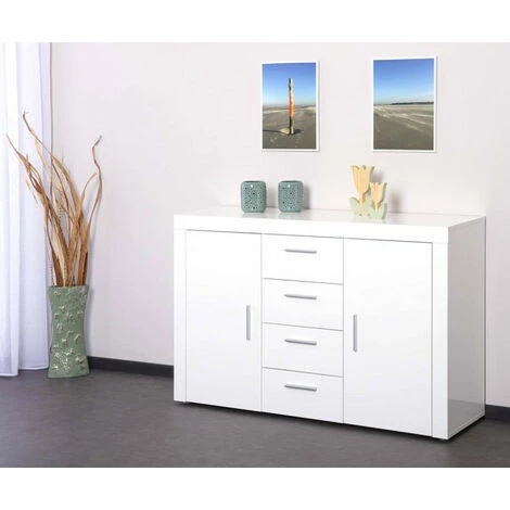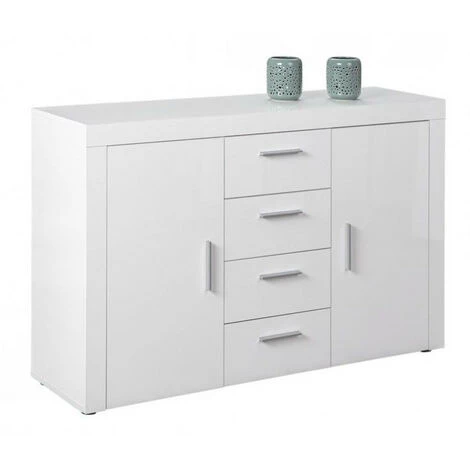 Grâce à son design chic et élégante, cette commode est parfaite pour embellir votre intérieur. Elle est faite en panneaux de particules avec une finition mélaminée et brillante, sa structure est dotée de 2 portes et de 4 tiroirs vous offrant un large espace pour optimiser votre rangement.Matière Panneaux de particulesFinition mélaminé brillantL 134 x H 86 x P 40 cm – 47 kgAvec 2 portes et 4 tiroirs sur rails coulissantsCertifié FSC Garantie 2 ansNous ne livrons pas en Corse.