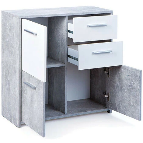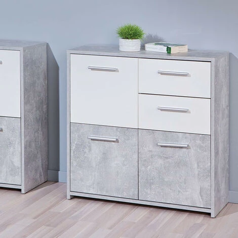 Cette belle commode effet béton et mélaminé blanc sera parfaite pour apporter une touche de modernité à votre déco. Elle est équipée de 3 portes et de 2 tiroirs vous offrant un large espace pour optimiser votre rangement.Matière Panneaux de particules certifié FSCFinition mélaminéeL 78 x H 77 x P 30 cm – 23 kgAvec 3 portes et 2 tiroirs sur rails coulissantsGarantie 2 ansNous ne livrons pas en Corse.