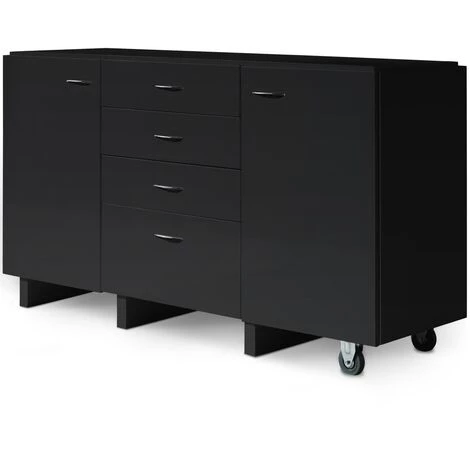 La commode noire de rangement extensible de la collection Kingsize est un meuble très pratique.Cette commode en Bois MDF de couleur noir composée de 2 parties est extensible, une partie est à roulettes. Il vous permet ainsi de bénéficier d’une plus grande surface de rangement et de placer des bibelots dans les niches créées par l’extension du meuble.Nous ne livrons pas en Corse.