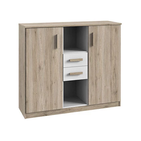 Votre chambre à coucher révèle un style contemporain à travers cette commode 2 portes 2 tiroirs chêne et blanc FALBA. L’agencement des compartiments au niveau de la façade est tout à fait original, faisant profiter d’une praticité en termes de rangement. Cette commode comporte deux portes spacieuses sur les côtés, parfaites pour ranger discrètement vos effets personnels. Les deux tiroirs accolés qui séparent les deux portes offrent un aspect flottant grâce aux niches qui les encadrent en dessous et en dessous. La couleur chêne s’impose sur les surfaces de la commode, agrémentée par un soupçon de blanc sur les tiroirs.