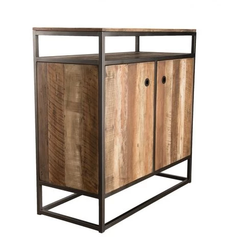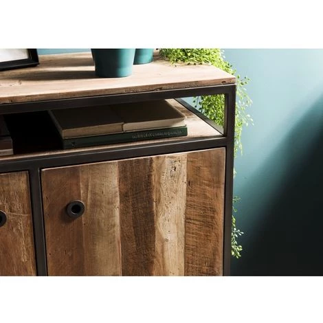 Buffet 2 portes et 1 étagère Teck recyclé Acacia Mahogany recyclé et métal noir. Dimensions : 90 x 40 x 90,5 cm. Article en Teck recyclé et Acacia, Mahogany recyclé. Cet article est composé de bois recyclé ! Le bois recyclé est un bois récupéré de vieilles charpentes, de coques de bateaux ou tout bois de récupération ayant déjà eu une longue vie. C’est ce qui lui donne cet aspect vieilli et authentique avec ses imperfections qui font tout son charme. Acquérir du bois recyclé est une initiative écoresponsable qui permet de lutter contre la déforestation. Meuble monté