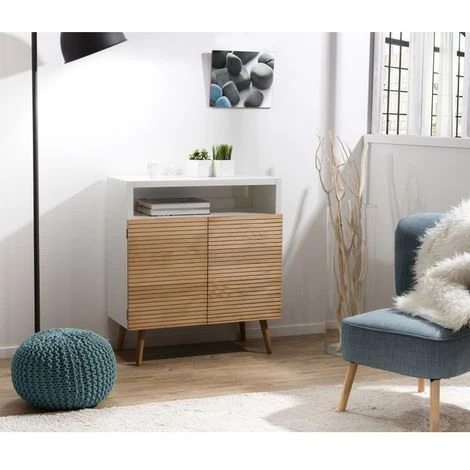 Buffet 2 portes bois clair et blanc. Dimensions : 80 x 38 x 89 cm. Article en MDF et pin. Style 100% scandinave qui nous donne envie de changer d’univers pour une ambiance claire et chaleureuse. Meuble monté, pieds à visser