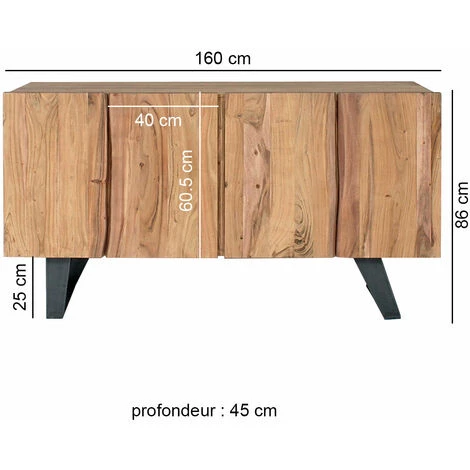Amenez une touche naturelle au sein de votre lieu de vie ! Choisissez ce meuble qui reflète l’authenticité à l’état pur grâce à sa structure conçue en bois d’acacia ! Son réel point différencient, l’effet tronc d’arbre. On aime beaucoup le design atypique et irrégulier souligné au niveau des extrémités des portes avec des ondulations dans le bois. Cet aspect brut et naturel amène une touche de modernité et une réelle dose de convivialité. Doté de 4 portes battantes, ce buffet dispose également de deux étagères qui vous aideront à organiser votre rangement.