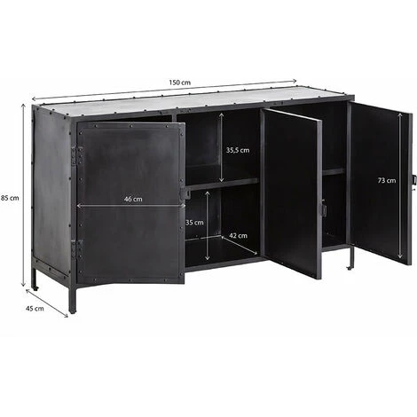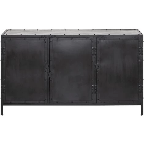A la recherche d’un bon basique, d’une valeur sûre ? On a ce qu’il vous faut. Un buffet tout métal pour amener une atmosphère 100% industrielle dans la pièce de votre choix.Il est conçu entièrement en métal noir ce qui affirme son style tendant vers l’industriel. Les rivets apparents et le système de fermeture du meuble donnent cette allure vintage qui fait la particularité du produit. Derrière ses 3 portes battantes se loge une étagère qui vous permettra d’organiser votre rangement. Sachez que ce meuble est livré monté, dès réception, vous n’aurez qu’à le disposer dans la pièce de votre choix.